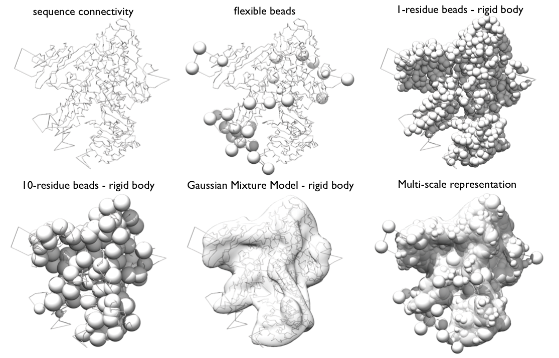 Beads and Gaussians of a given domain are arranged into either a rigid body or a flexible string, based on the crystallographic structures. In a rigid body, all the beads and the Gaussians of a given domain have their relative distances constrained during configurational sampling, while in a flexible string the beads and the Gaussians are restrained by the sequence connectivity.